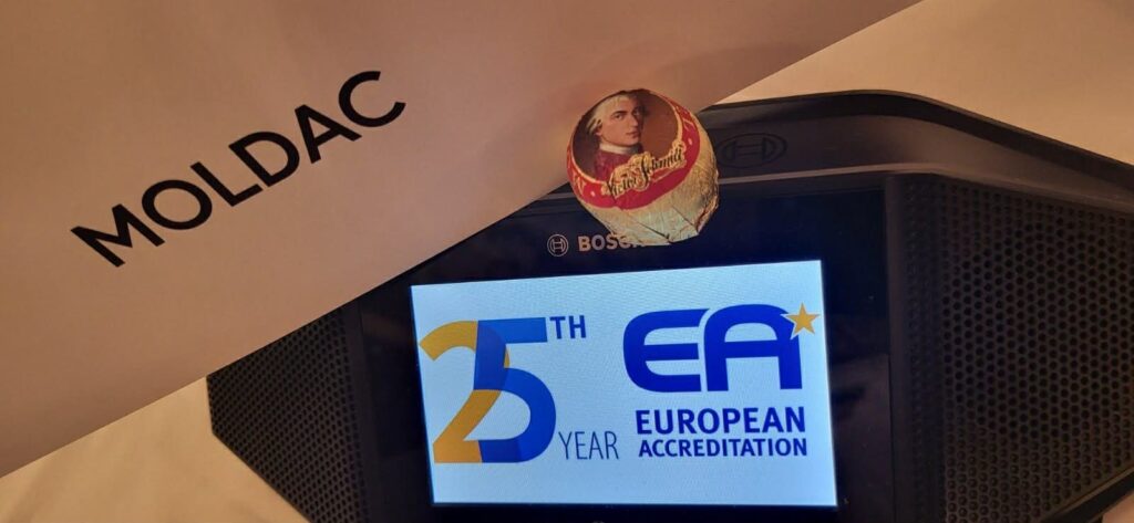 În perioada 19–20 noiembrie 2025, Dl Iurie FRIPTULEAC, Director MOLDAC, și Dna Natalia MIHĂESCU, Șefa Direcției Acreditare Organisme de Certificare și Inspecții, au participat la Ședința Asambleei Generale a Cooperării Europene pentru Acreditare (EA GA), desfășurată la Viena, Austria, care a reunit managementul de vârf al Organismelor Naționale de Acreditare (ONA) membre EA.